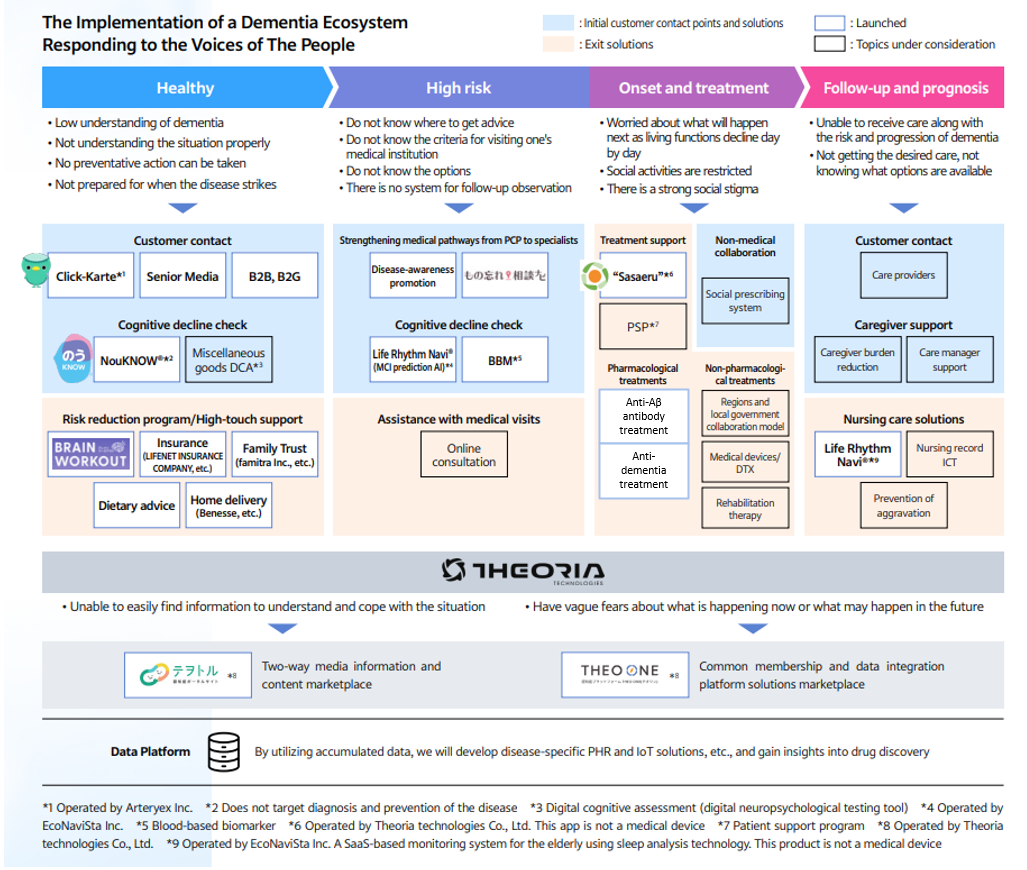 The above solution package includes projects under consideration *1 Self-checking tool (non-medical device), which individuals can check their cognitive functions by themselves with quantified brain performance data through simple card games utilizing PC or tablet-type device. *2 Cerebrospinal fluid *3 Blood-based biomarker *4 Amyloid related imaging abnormality *5 Mild cognitive impairment *6 “Sasaeru” is an application that records Activities of Daily Living (ADL), which is important information in the treatment of dementia, and allows users to visually capture changes in ADL