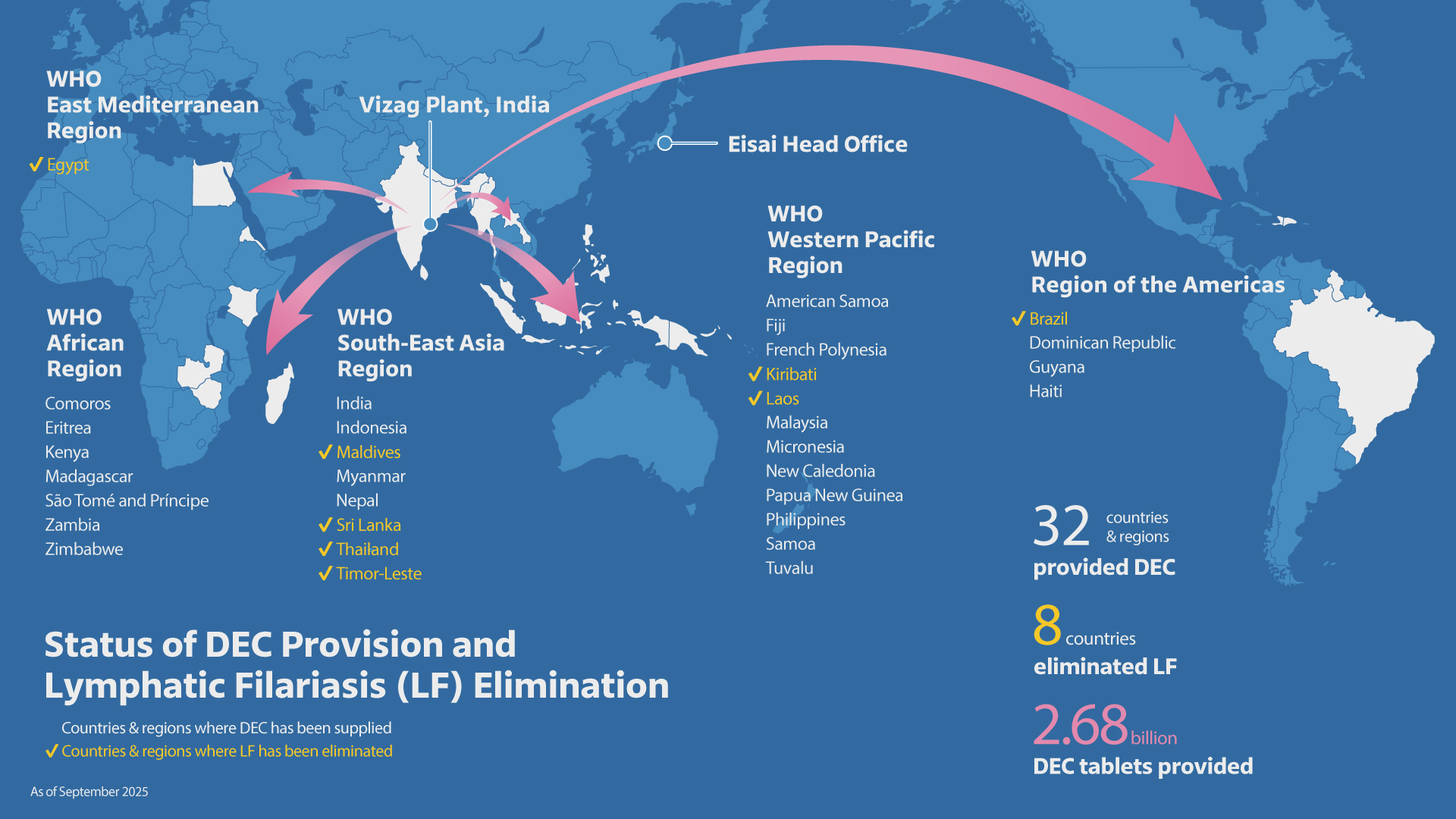 Eisai is committed to supplying tablets free of charge from its Vizag Plant in India to millions of people at risk in lymphatic filariasis endemic countries through the World Health Organization until the disease is completely eliminated in these countries.