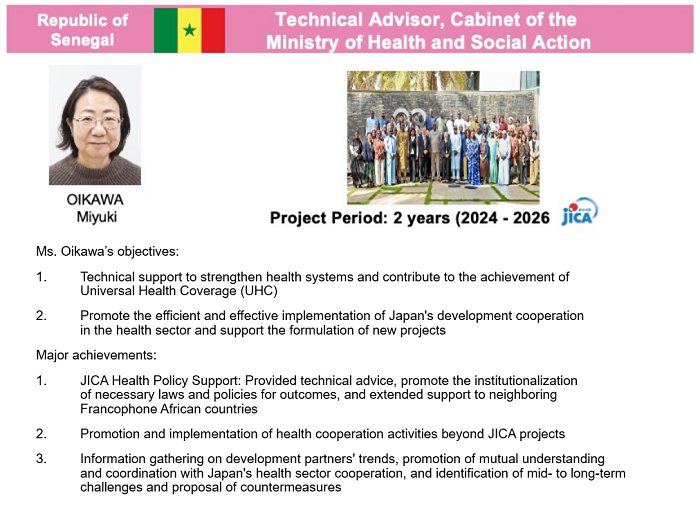 Ms. Oikawa is a member of the Bureau of Global Health Cooperation, the Japan Institute for Health Security (JIHS). Since May 2024, she has been dispatched by the Japan International Cooperation Agency (JICA) as a Technical Advisor to the Cabinet of the Ministry of Health and Public Hygiene of the Republic of Senegal. In this role, she provides strategic advice for health sector projects implemented by JICA, supports the execution of policies for the Ministry of Health and Public Hygiene of Senegal, and offers guidance to Japanese corporations and universities active in Senegal’s healthcare sector.