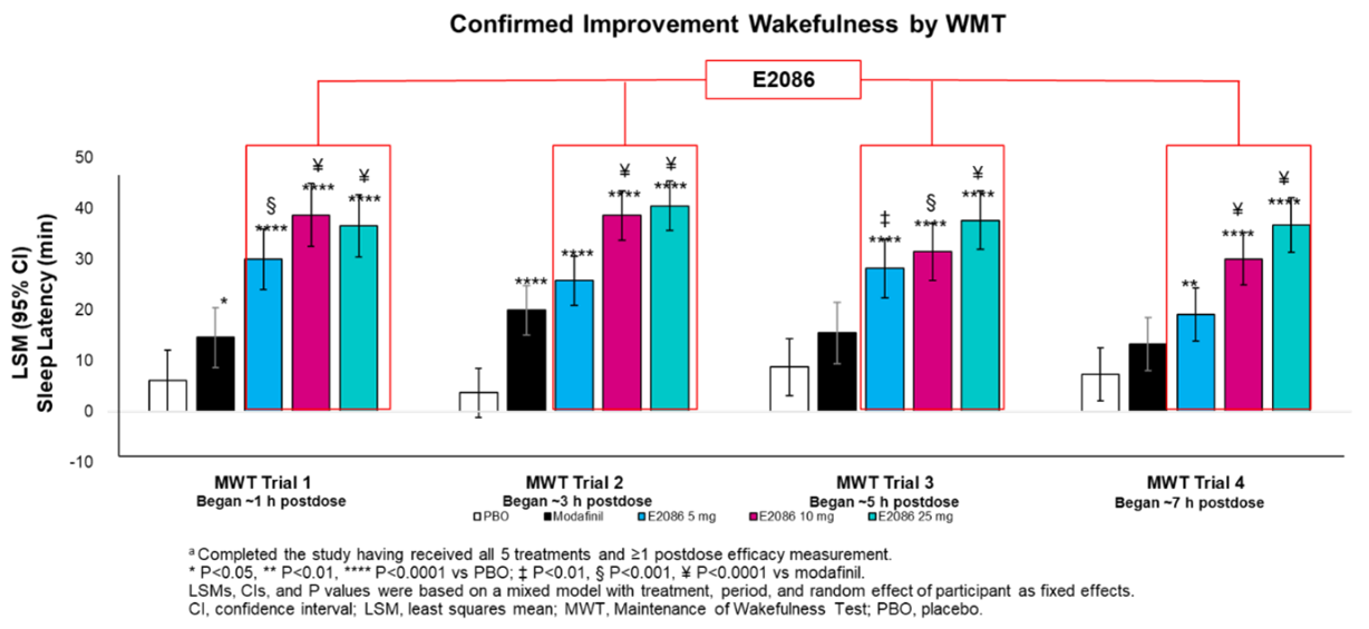 For the KSS, all doses of E2086 showed statistically significant higher alertness compared with placebo (P<0.0001), while E2086 10 mg and 25 mg demonstrated statistically significantly higher alertness compared with modafinil (P<0.0001). These outcomes confirmed the Proof of Mechanism for E2086.
