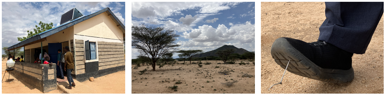 On the third day, we visited Lomil Dispensary. It is a small, isolated facility situated in an arid area. It was only reached after driving more than 10 kilometers on an unpaved road from the main road. Livestock and their feces were scattered around the facility, and Acacia thorns sharp enough to pierce through rubber shoe soles were found everywhere on the ground. People would need to be cautious even just walking around bare foot or even in sandals.