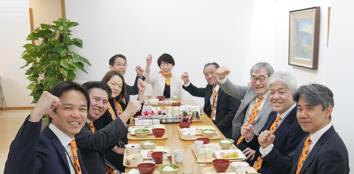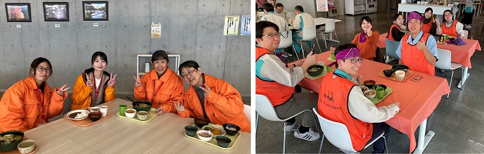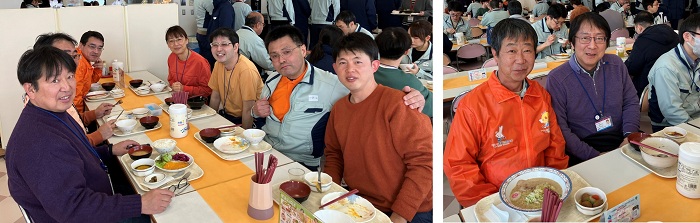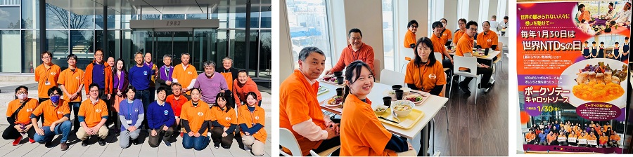 Orange tablecloths added a vibrant atmosphere to the cafeteria of Kawashima Industrial Park. Employees wearing orange and purple outfits and accessories enjoyed lunch while chatting, creating a valuable opportunity to develop their understanding of NTDs.