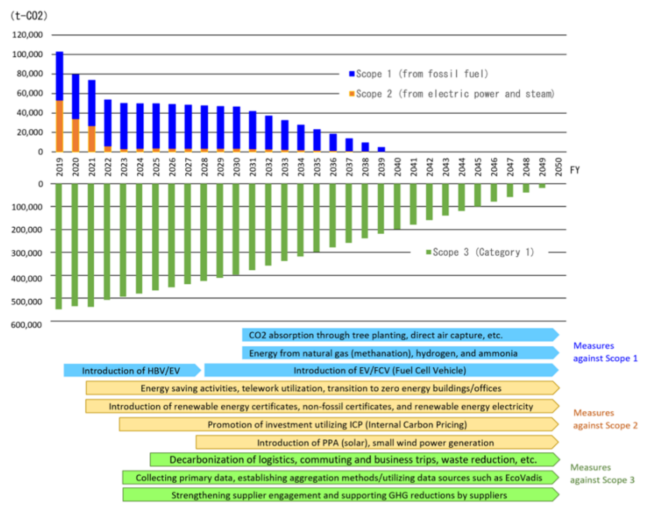 In FY2024, we continued to promote global initiatives aimed at reducing greenhouse gas emissions. Our multifaceted efforts including ongoing energy conservation, transitioning to electrification, expanding the use of renewable energy, and working toward 100% adoption of hybrid and electric vehicles for sales fleets in Japan. We also steadily promoted environmental investments through our Internal Carbon Pricing (ICP), and actively engaged with suppliers to encourage sustainable practices. Furthermore, in response to international disclosure standards and stakeholder expectations, we initiated the development of a “Transition Plan for Climate Change Mitigation.” This plan incorporates scenario analysis, assessment of climate-related risks and opportunities, strategies and roadmaps for reducing greenhouse gas emissions (Scopes 1, 2, and 3), alignment with financial and investment planning, and the establishment of governance structures. Through these comprehensive and actionable efforts, we are strategically driving progress toward achieving our 2050 Net-zero emission target.
