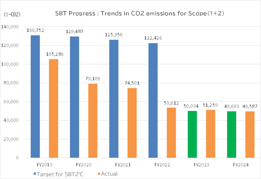Note: The actual Scope 1 and 2 emissions for FY2019 are different from the Scope 1 and 2 emissions for the base year (FY2019) of the SBT 1.5℃ target, which is 102,512 tons, due to adjustments to the boundary after FY2023, etc.