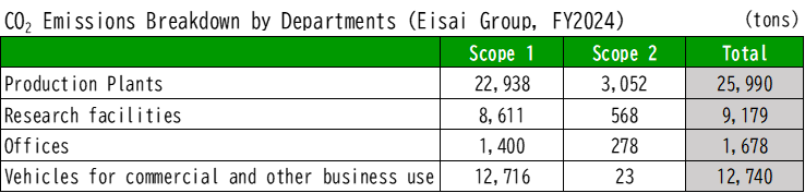 In March 2024, the Plant officially began operating full-scale operation of an energy management system to optimize the power consumption by collecting and analyzing energy consumption data associated with the operation of the equipment. At the European Knowledge Center (The United Kingdom), biogas was introduced across the site, including office areas, leading to a reduction of approximately 560 tons of CO₂ emissions in FY2024 compared to the previous year. Additionally, at the Vizag site (India), the fuel source for boilers was switched from light oil to natural gas, resulting in a reduction of approximately 760 tons of CO₂ emissions in FY2024 compared to the previous year. We continue to promote the use of renewable energy at our factories and research laboratories both in Japan and overseas.