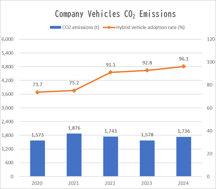 In fiscal 2024, CO2 emissions from company vehicles totaled 12,464 tons, representing a 7.6% increase compared to the previous fiscal year. In Japan, Eisai Co., Ltd. and EA Pharma Co., Ltd. achieved a 100% hybrid and electric-powered vehicle adoption rate for gasoline-fueled company cars, effectively minimizing the increase in emissions.