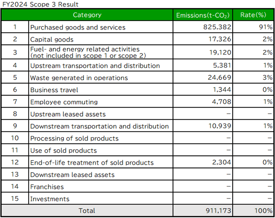 For Scope 3, Category 1 emissions based on purchased goods and services, the aggregation method was changed to be more precise from fiscal 2022, when the SBT 1.5℃ was set. Additionally, for fiscal 2024, the data used for calculation was revised and the calculation method was modified to further refine our calculation approach. Consequently, the emissions for fiscal 2024 increased by 80.9% compared to fiscal 2019 and by 46.4% compared to the previous fiscal year. The category 1 emissions accounted for 91% of our total Scope 3 emissions, which amounted to 911,173 tons. Going forward, we will promote the reduction of Scope 3 emissions by strengthening our cooperation with suppliers and establishing a calculation method that better reflects the actual situation, for example by reflecting primary data on CO2 emission reductions by suppliers in the aggregation.