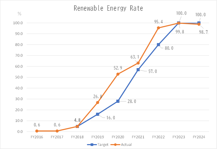 As a result of these efforts, the renewable energy adoption rate for externally purchased electricity used in our business activities reached a high level of 98.7%.*4