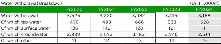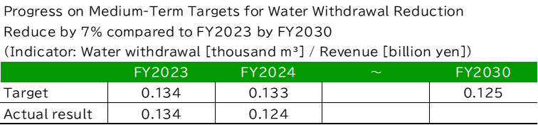 Progress toward the FY2030 water withdrawal reduction target is reflected in the FY2024 performance, with the indicator (water withdrawal [thousand m³] / revenue [100 million yen]) recorded at 0.124, which is below the FY2024 target of 0.133. The amount of water withdrawal was 3,168 thousand m³, representing an approximately 8% decrease compared to FY2023 when using the same boundary. This reduction is attributed to efforts at each site to promote efficient use of water resources, including water recycling, which helped suppress overall water consumption. In addition, the Kawashima Plant (Gifu Prefecture) constantly pumps up groundwater and discharges it to maintain the river at the request of the local government. The flow meter in the well for pumping up failed, resulting in conservative estimates in FY2023, but repairs have enabled actual measurements to be taken in FY2024.