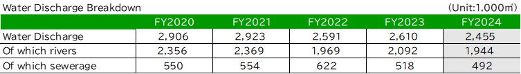 The amount of water discharge was 2,455 thousand m³, representing an approximately 7% decrease compared to FY2023 when using the same boundary. This reduction is partly due to the Kawashima Plant, where water is stored and discharged into a pond in the on-site Japanese garden. In FY2024, the inflow of rainwater decreased, resulting in a lower volume of water discharge. Additionally, at the Bogor Plant (Indonesia), a new flow meter was installed in the sewage channel, enabling direct measurement. As a result, the recorded water discharge volume decreased.