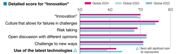 “Innovation,” one of the challenging categories, improved by one point year-on-year, reaching a total of 70 points. Within this category, the question with the greatest improvement was “use of the latest technologies,” which rose three points from the previous fiscal year. Each of the other four questions linked to fostering a culture that facilitates innovation improved by one point year-on-year. Nevertheless, this category overall still has considerable room for improvement.