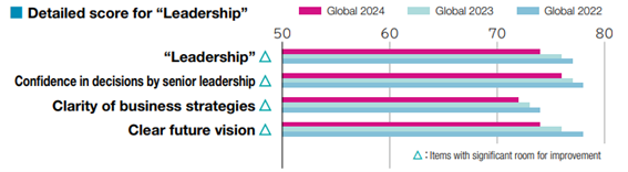 Another challenge category, “Leadership,” declined by two points year-on-year, marking a second consecutive year of decrease. This category reflects the score for employees’ sense of satisfaction with the company’s vision, strategies, and plans, which was significantly affected in some regions by a temporary uncertainty regarding new product approvals, which have now been granted. Addressing information asymmetry between the company and employees regarding management information, as well as strengthening two-way dialogue, has been designated as an important common global action. We are working to enhance both the quality and quantity of town hall meetings where executives engage with employees, and to improve methods of information sharing. While some regions have seen results, we recognize that further continuous efforts will be necessary for employees’ sense of satisfaction.