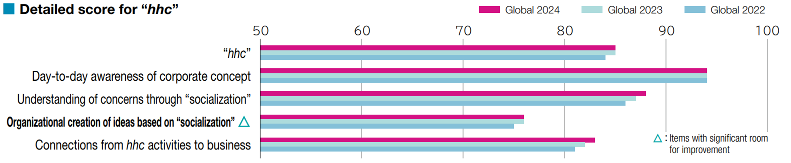 Regarding understanding and practice of our corporate concept, “hhc,” the item “Understanding of concerns through socialization” improved by one point, indicating progress in employees’ individual socialization. On the other hand, “Organizational creation of ideas based on socialization” remained at 76 points, showing limited growth and leaving significant room for improvement. Strengthening efforts in this area alongside building a culture of innovation will continue to be necessary going forward.