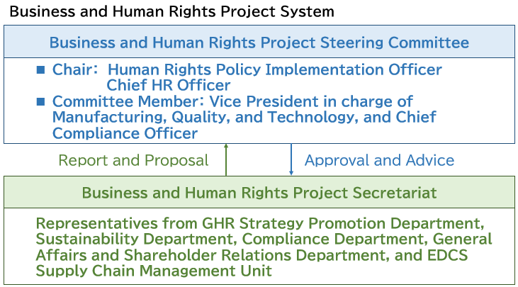 In 2018, we established a cross-organizational Business and Human Rights Project with the aim of implementing human rights initiatives and conducting human rights due diligence based on our Human Rights Policy, as is expected by the international community. This project is managed by the Business and Human Rights Project Steering Committee, chaired by the Chief HR Officer and comprising the Vice President in charge of Manufacturing, Quality, and Technology, and the Chief Compliance Officer. The Steering Committee meets twice a year in principle. The project initiatives are led by the secretariat comprising representatives from the GHR Strategy Promotion Department, Sustainability Department, Compliance Department, General Affairs and Shareholder Relations Department, and EDCS Supply Chain Management Unit.